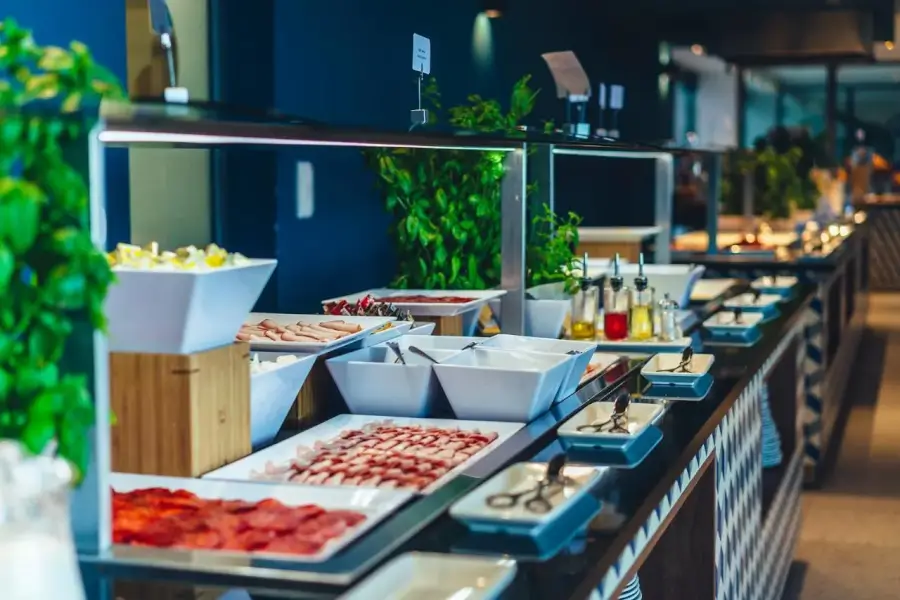 Glavna restavracija, tik ob plaži, nudi veliko prostora za obedovanje v zaprtih prostorih ter dve terasi s čudovitim pogledom na morje. Restavracija ponuja samopostrežni zajtrk, kosilo in večerjo s pestrim menijem in raznolikimi jedmi. Samopostrežni bife vključuje izbrane pijače, kot so vina, piva, sokovi, kava, čaj itd. Bar s prigrizki poleg neskončnega bazena. Čez dan so na voljo tudi prigrizki. Bar je odprt od 8.00. do 24.00. Poleti je na platoju za sončenje ob morju pred glavno stavbo hotela tudi beach bar.